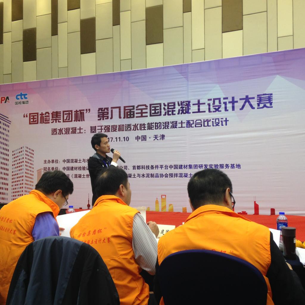 为响应国家海绵城市建设理念,本届大赛以“透水混凝土:基于强度和透水性能的混凝土配合比设计”为主题,吸引了来自全国高校和企业共63个代表队参赛,按照会议要求派出一支由本科生组成的队伍参赛。学生们在实验室展开了实验和研究,确定了合理的配合比并按组委会要求准备好参赛试块。在现场经过试块抗压强度测试、透水性能测试和答辩环节,宋海清老师指导的由赵阿虎、陈林松、周扬锋、李文文四位学生组成参赛队伍提交的混凝土试块获得了“透水混凝土强度32.4MPa,透水系数11.9mm/s”的优秀成绩。通过此次参赛学习了透水混凝土设计的先进技术。
